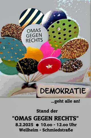 Am Samstag, 08. Februar 2025, 12.00 Uhr ab Sendlinger-Tor-Platz, findet anlässlich der bevorstehenden Bundestagswahl ein bundesweiter Aktionstag der OMAS GEGEN RECHTS statt. Unter dem Motto “Für Vielfalt und Demokratie und gegen Hass und Hetze” organisieren die OMAS GEGEN RECHTS München und Süd einen Demonstrationszug in der Münchner Innenstadt. Die Demo beginnt am Sendlinger Tor um 12.00 Uhr, wir gehen über die Sonnenstraße zum Karlsplatz/Stachus. Dort gibt es eine Kundgebung der OMAS und um ca. 13.00 Uhr gehen/fahren wir – nicht als Demozug – zur Theresienwiese.