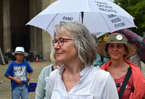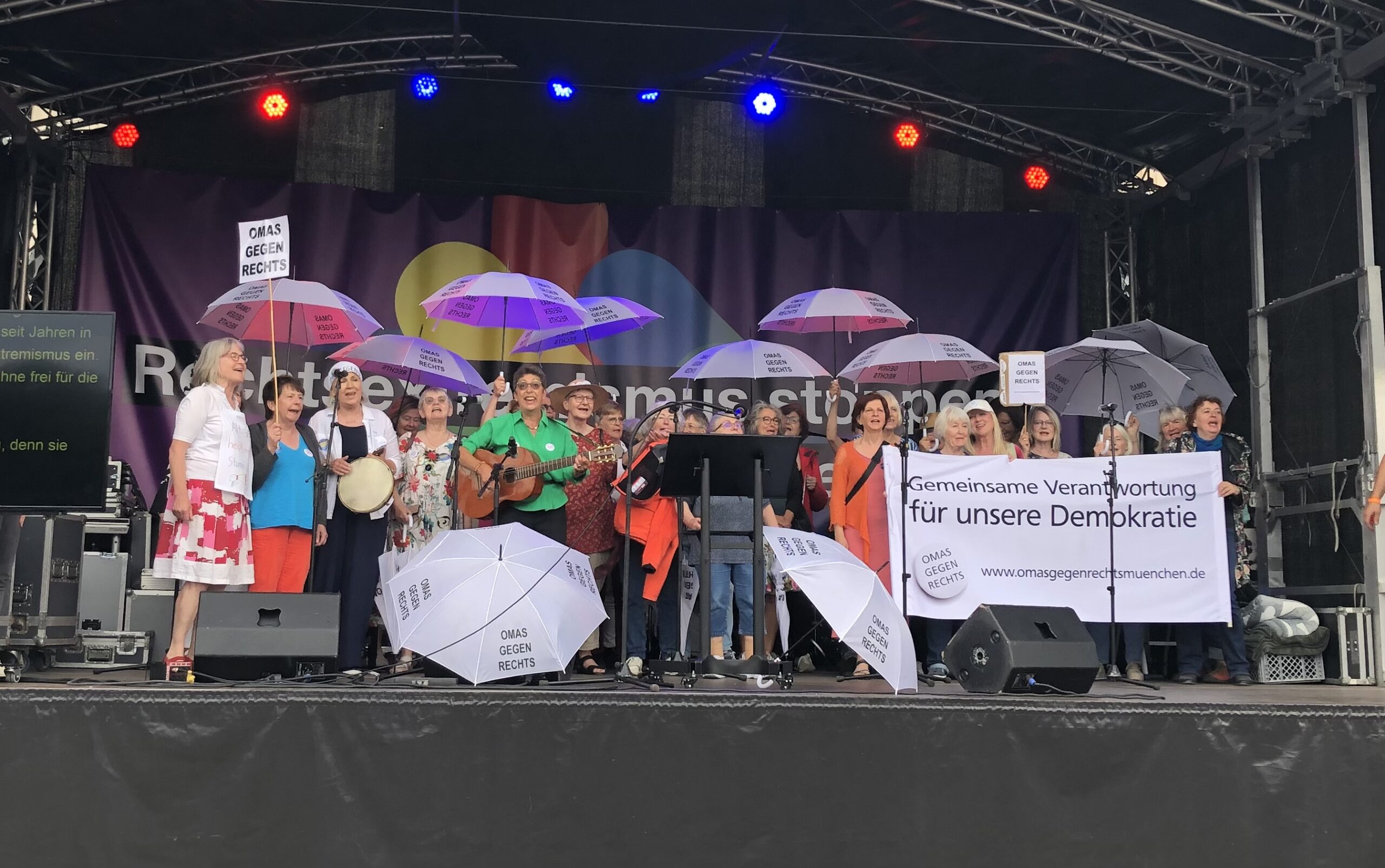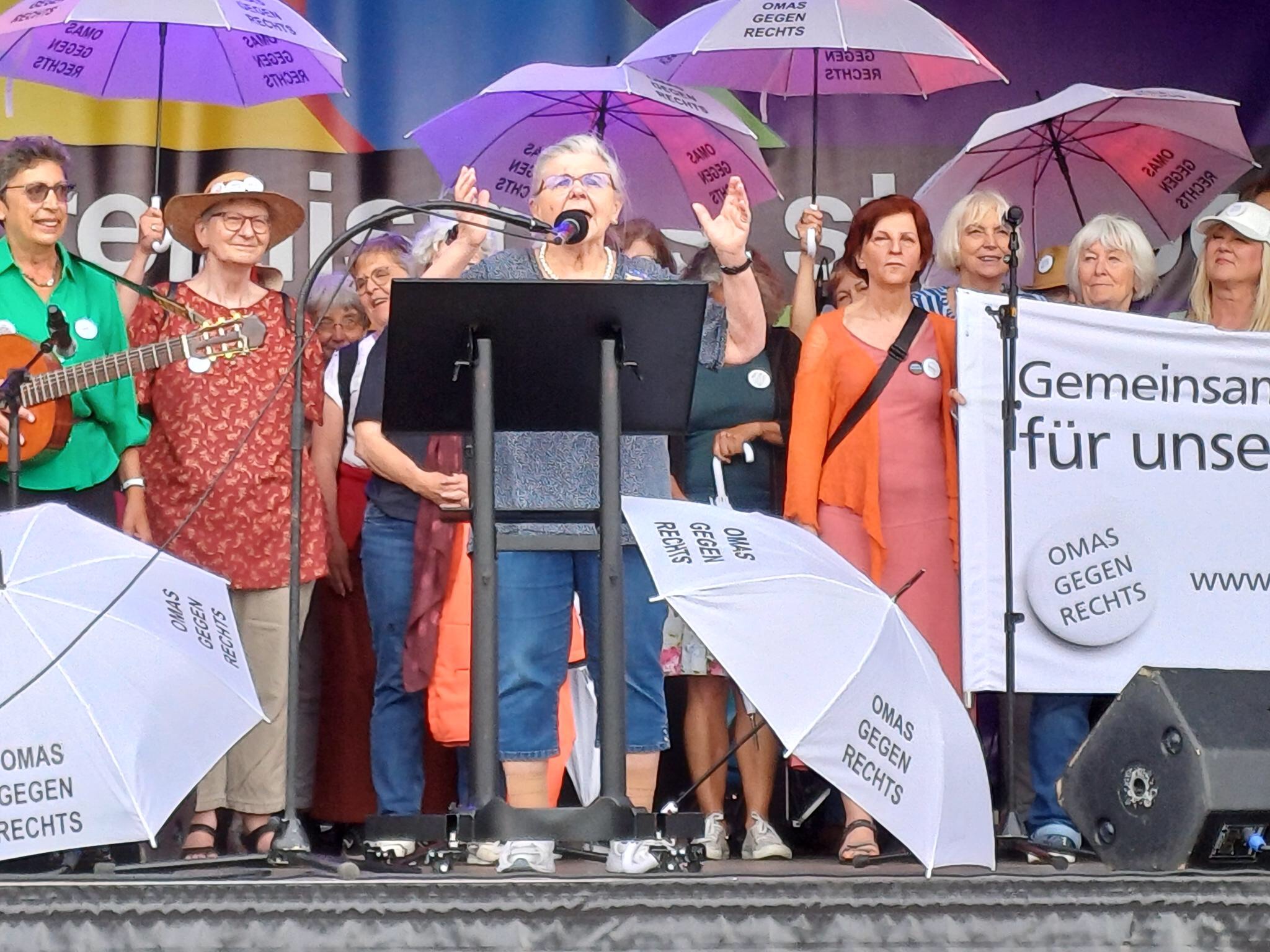 Und natürlich waren auch die OMAS GEGEN RECHTS München dabei! OMA Uschi hat die Teilnehmer mit ihrer Rede begeistert! Sie forderte auch die jüngsten Wählerinnen und Wähler auf, eine demokratische Partei bei der Europawahl zu wählen und damit Verantwortung für ein demokratisches Europa zu übernehmen. Der Chor und die Vorsängerin OMA Constanze begeisterten die Demonstranten!
